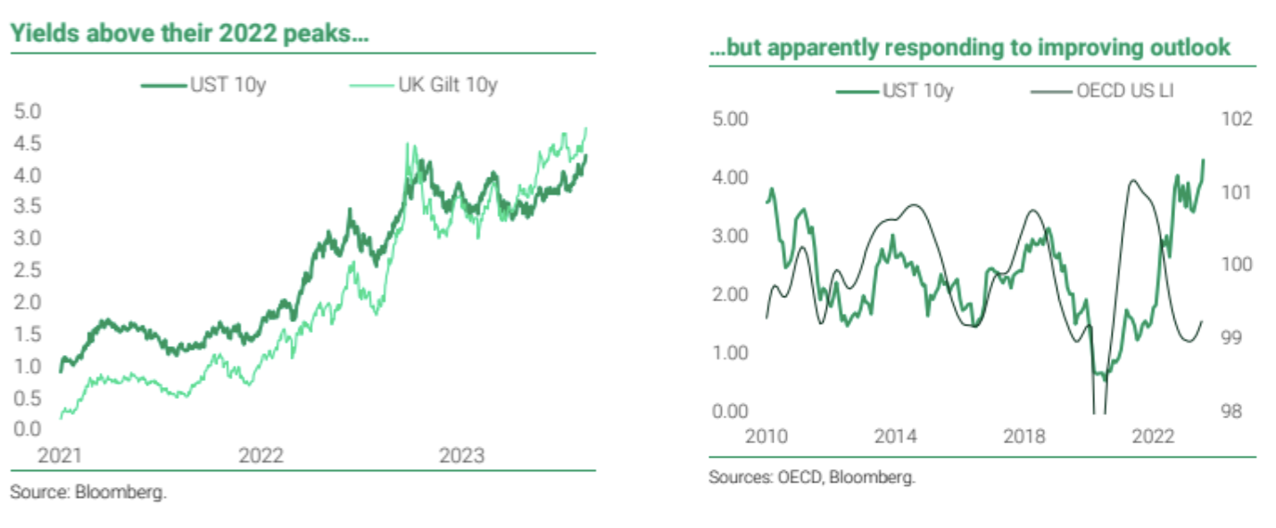 The reason for the rise in yields matters. In 2022 it was mainly the result of sudden changes in monetary policy expectations – combined (UK case, with botched fiscal-policy changes). This time around, the rise in yields appears to be the result, at least in part, of an improving macro outlook (top right chart) even in the face of tighter policy.