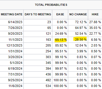 Not too long ago, markets were pricing potential for a rate cut at the July meeting. That has been pushed out to November as the “hold-and-see” narrative takes over from the hiking rates narrative as the data continues to hold up stronger than expected.