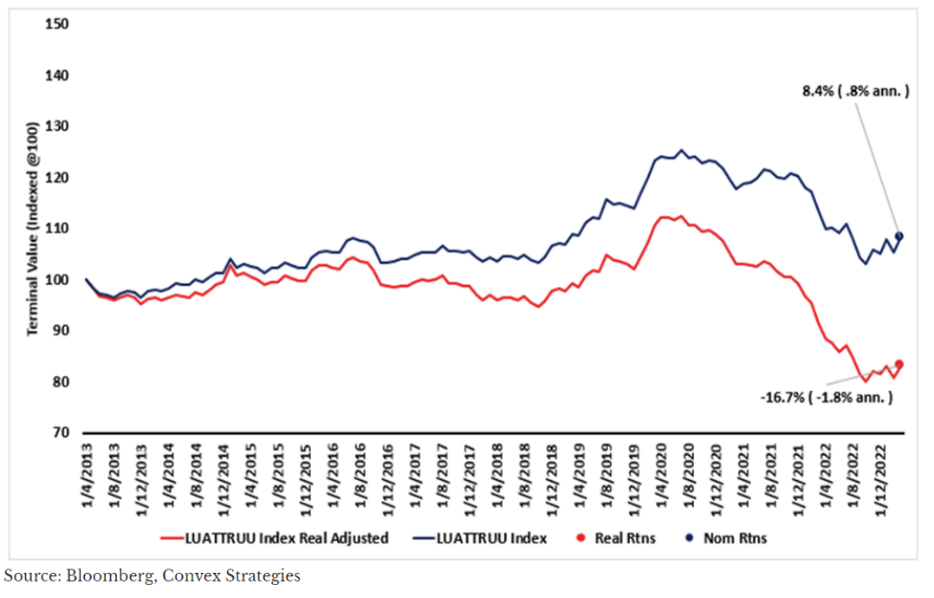 US Treasury Total Return Index Nominal (black) and Real (red): Apr 2013 – Mar 2023
