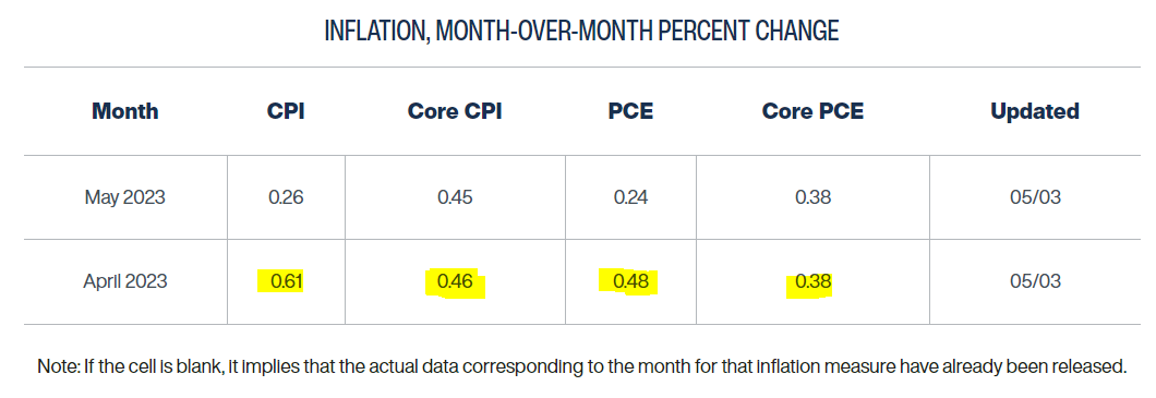 In addition, the next CPI data comes on 5/10. Highlighted in the Cleveland Fed Graphic #1, their estimate on the monthly print for both Headline and Core Inflation data are notably higher than Bloomberg estimates shown in Graphic #2. This will be interesting as the Headline data will account for the large oil spike following the surprise OPEC production cut last month.