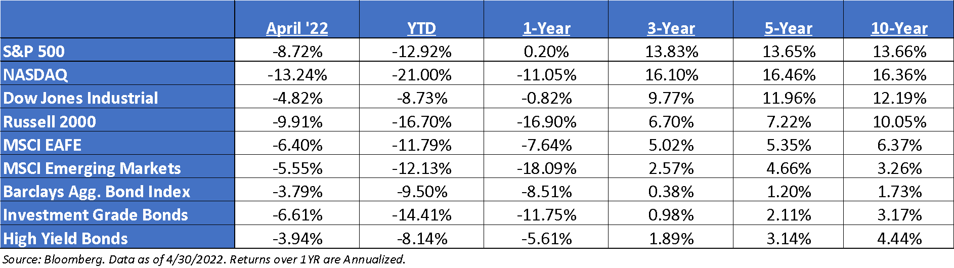 April showers doused bullish sentiment last week as the SPX wrapped up April with an 8.8% decline. This was the worst April return for the index since 1970 and the fourth lowest April return on record. Fear over this week’s FOMC meeting, mixed earnings reports, rising interest rates, and inflation anxiety kept buyers at bay. Economic data didn’t help as headline GDP unexpectedly contracted and consumer confidence faded. Outside of the U.S., China ramped up stimulus efforts with an ‘all out’ pledge to boost infrastructure spending to combat their contracting economy (April PMIs dropped to multi-year lows last week). The greenback also made headlines as the US Dollar index climbed to its highest level since ’02.
