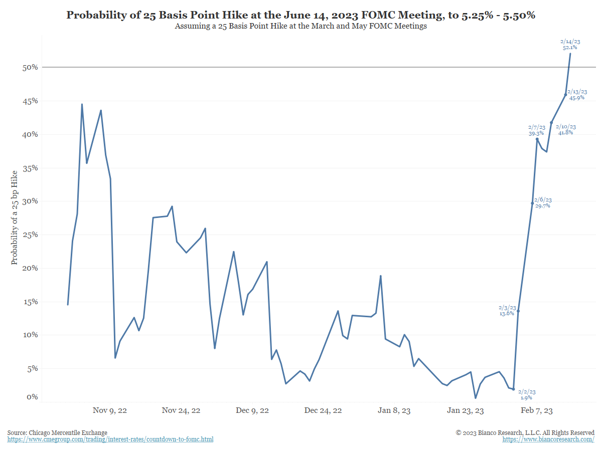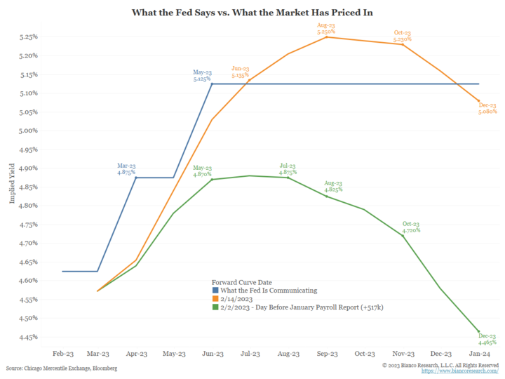 This is a massive change in Fed expectations in just 12 days. We believe for the first time this entire hiking cycle, the market is pricing relatively close to what the Fed is suggesting. No more “pivots,” “pauses,” or “step downs.” The market is pricing a 100% probability the Fed will hike 25 basis points on March 22, to 4.75% to 5.00%.