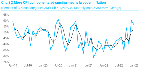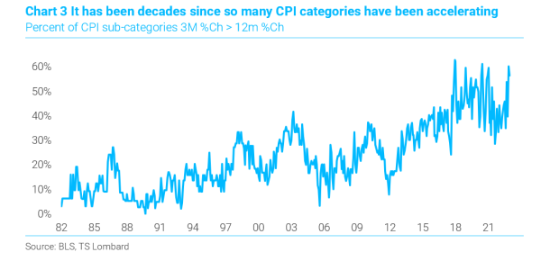 TS Lombard runs a diffusion index showing the January CPI data (percent of CPI sub-categories with 3M rates of change greater than their 12M % Change) that remains elevated and has been climbing since summer.