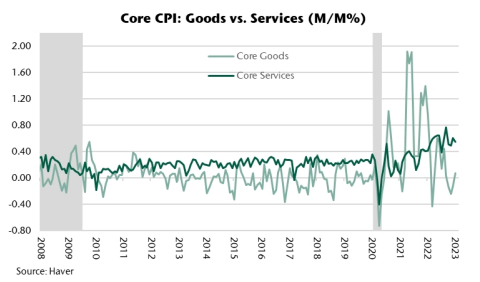 We still expect a 25-bp hike in both March and May, which would take the target range to between 5% and 5.25%. The toss-up about the March 21 meeting remains whether they signal another 25-bp for June, mostly likely by retaining the “ongoing increases” clause in their latest statement. To be sure, and after this report, they’ll use their communication tools to dim hopes of any rate cuts this year and to stress that policy must stay restrictive for some time.