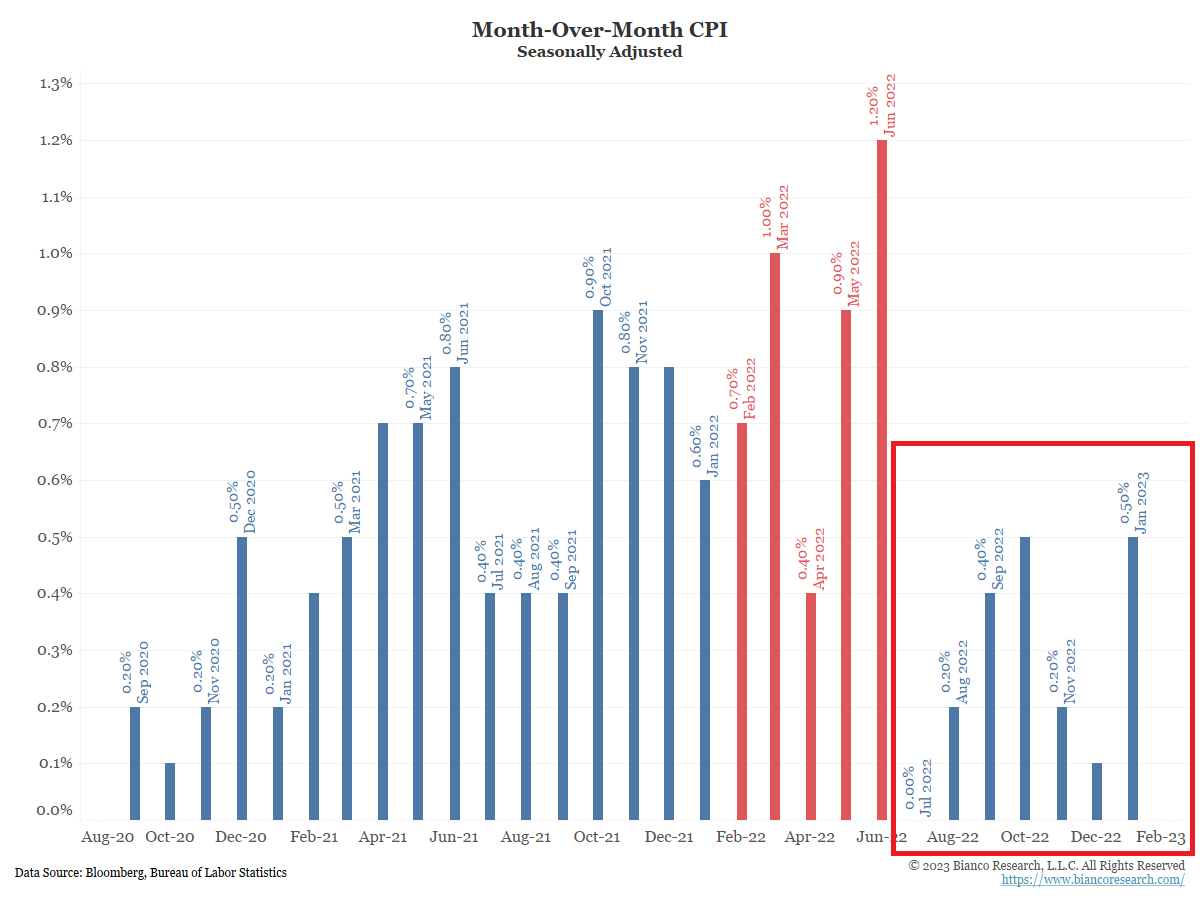 Between February 2022 and June 2022 (red), the M/M change in CPI was much higher than in the 2020 period. This means the current monthly numbers will have a much higher bar to surpass if inflation is going to remain elevated. This month’s 0.5% M/M change replaced a 0.6% M/M change from January 2022, which helps explain the slight drop in Y/Y headline inflation. The narrative quickly changes in July. Note the M/M (shown above in red box) changes between July and December 2022 were much lower.