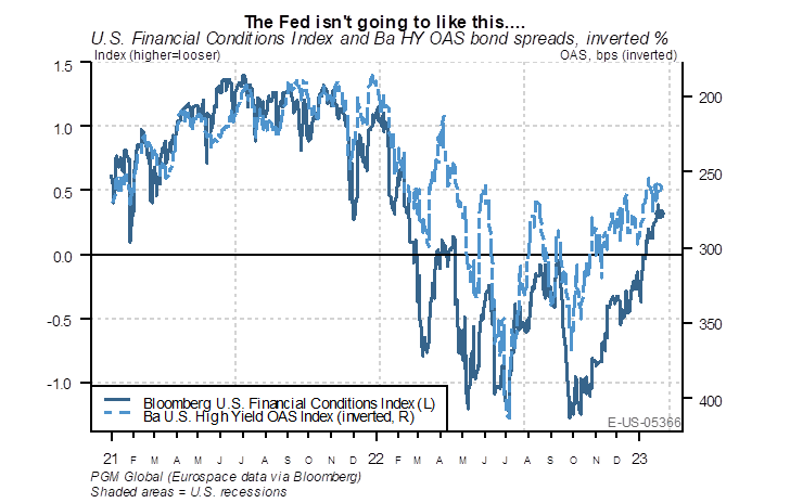 For example: Equity multiples have expanded – the S&P 500 is back to 18x 2023 earnings. Lower long-dated interest rates – 10 year yield back to 3.5%. Tighter credit spreads/ high yield spreads, and lower mortgage rates also point to easier financial conditions in our opinion.