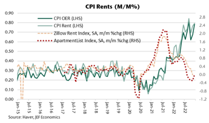 There was a notable upside surprise to shelter, which printed 0.8% (vs 0.7% exp). Real-time rents have slowed, so the upside surprise is something that is poised to slow here in 2023 (CPI rents and OER lag real-time rents by about 1 year). Although market rents are no longer rising, and have in fact declined in recent months, the lagged effects of past increases are still feeding putting upward pressure on CPI rents and OER.