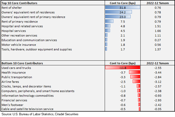 Goods deflation continued for the third straight month, led by used cars -2.5% and new cars -0.1%. The drag in December came mostly from volatile components, including energy (-4.5% m/m), food (0.3% m/m, which was the smallest increase since Mar’21), used cars (-2.5%), tech products (-0.9%), and airfares (-3.1%).