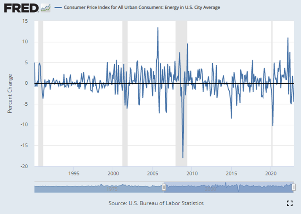 Core services ex-shelter and medical (a new favorite of the market) rose a pretty modest 0.25% and now annualizing at 5.0% over the last 3 months. Energy prices were down, but some of the core services components rebounded a bit this month, so this composition of the number may not be as encouraging as the headlines (more on energy below). For example, both medical care services and transportation services were up on the month after negative readings last month. The Fed has flagged core services as the most important component for monetary policy.