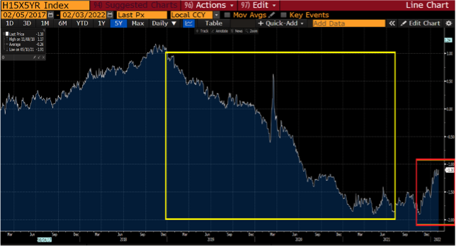 Since the economy began to stabilize in early 2021 and investors started to see the light at the end of the “COVID tunnel,” 5-Yr TIPS yields turned sideways (still in very negative territory) as investors remained concerned about inflation, thinking that the Fed was likely falling behind the curve given the rocky and uneven recovery in the labor market. As a result, real rates chopped sideways in very negative territory for much of 2021 while nominal rates steadily climbed higher. This resulted in market- based inflation expectations via 5-Yr breakeven to rise, peaking at just over 3% in November. Once the Fed took a more hawkish pivot in December, however, 5-Yr TIPS yields began to climb and recently reached new one- year highs as the market gained confidence that the Fed would, and could, control inflation given the hawkish shift in tone. Underscoring that point, the 5-Yr Breakeven inflation rate has pulled back by 40-50 basis points to the mid-2.70% zone, which is still above the Fed’s target but notably below the highs.