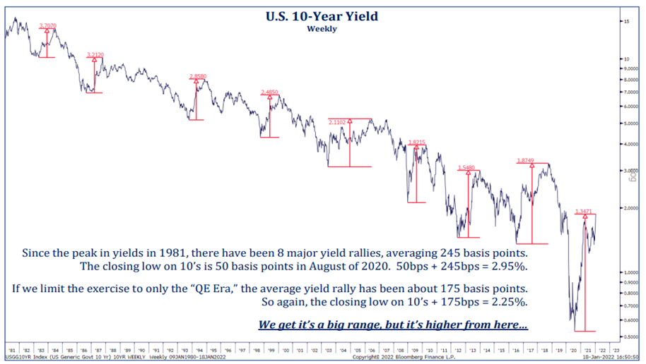 We’ve been getting the same question from clients the last few weeks, “how high can rates go?” The move in rates to start ’22 has been eye opening. 10s started ’22 at 1.51% and currently sit at 1.86%, a 23% increase… in 19 days. So, how much higher can they go? Well, first we will state the obvious, being a bond market bear the last 40 years plus has been a widow maker trade. BUT if we had to guess, we’d look to the 2.25% – 2.50% area for a test. Since yields peaked in 1981, the average rate rally has been about 245 basis points… 245bps + the 2020 low in yields (about 50bps) gets us to 2.95%. If we limited the exercise to only the rate rallies in the QE era, the average move is 175bps. Again, 175bps + the low of 50bps = 2.25% (see graphic on pg. 2).