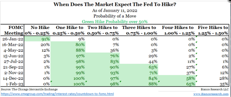 The market is pricing in 4 hikes in ’22 with an 80% chance of lift off in March. Following last week’s employment numbers (unemployment rate falling to 3.9%) indicating the job market is nearing in on full employment (plus wage pressures brewing). We believe the strong job market and the continuation of elevated inflation prints (7% today) puts the Fed in a spot where they will act (sooner rather than later) before allowing inflation to entrench consumer psychology more than it already has.