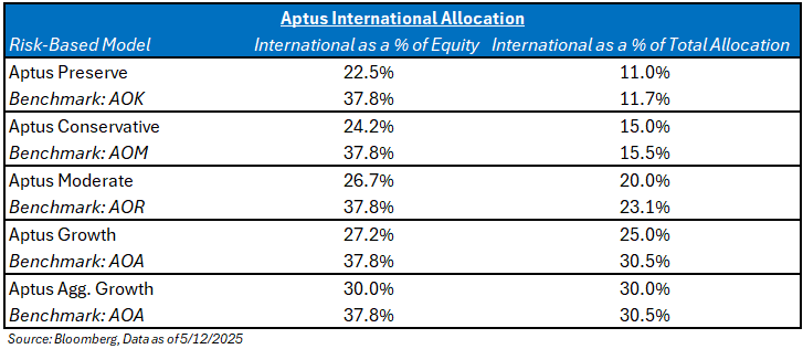 On a relative basis, we are underweight the benchmark to International as a percentage of equity. But our philosophy of more stocks, less bonds, while remaining risk-neutral, skews this figure. For example, our “Moderate” allocation owns 75% stocks, but maintains a 60%/40%-like standard deviation; you can see all the information on page 31 in our Asset Allocation slide deck (send us an email if you’re interested in viewing). On an absolute basis, we aren’t wildly underweight to the overall exposure of the benchmark.