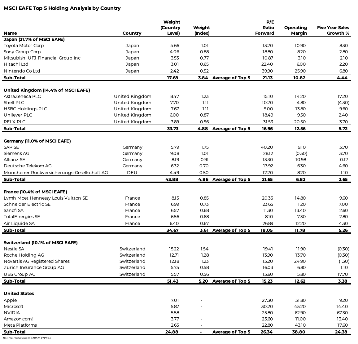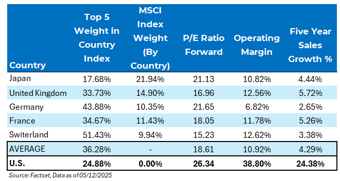 Every country except Japan has worse concentration issues than the U.S., but all have lower growth rates and operating margins. Then, if you take it a step further and look at the holdings that comprise each country, you’ll notice that, like the U.S., there is concentration in securities, but these concentrated holdings are also highly valued. For example, SAP in the DAX index is almost a 15% weighting that sports a 40x forward P/E and a growth rate of 4% – and this isn’t the only example within the aforementioned country indices.