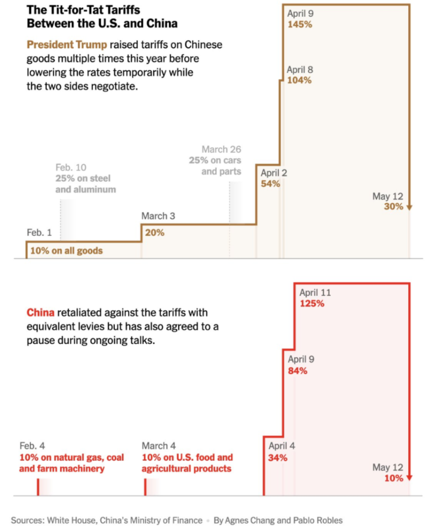 First, let’s touch base on Monday’s news: the US and China will temporarily lower tariffs on each other’s products in a move to cool trade tensions and give the world’s two largest economies three more months to resolve their differences. The combined 145% US levies on most Chinese imports will be reduced to 30%, including the rate tied to fentanyl, by May 14, while the 125% Chinese duties on US goods will drop to 10%. This is sending stocks into risk-on mode.