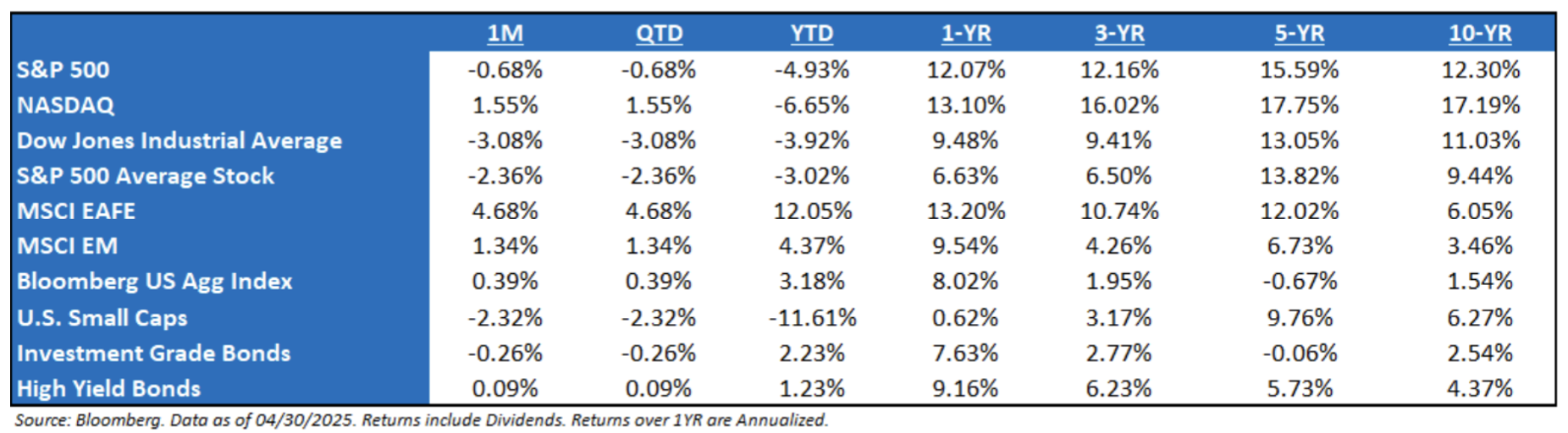 Market Recap – April 2025: The S&P 500 rallied to a one-month high in the last week of the quarter, rising nine straight trading days and recouped virtually all of the post-April 2, “Liberation Day” declines. First and foremost, the Trump administration has seriously backtracked on the April 2 announcement, including a delay, while negotiations take place and exempting major categories of imports (chips, electronics, pharma, autos). Additionally, the Q1 earnings season (which is not effectively over) was better than feared, and most analysts still have 2025 S&P 500 EPS between $260-$270. Finally, while sentiment data has been awful, “hard” economic data has held up well, including the recent (and important) Non-Farm Payroll Jobs report. Bottom line, the reality of the past month post “Liberation Day” hasn’t been as bad as feared and the market has recouped those losses. It should be noted that international markets have performed really well year-to-date, outperforming on the downside, but also during the recent upswing. The market has a lot to digest up until the July tariff extension – earnings growth and the labor market will likely determine the near-term direction.
