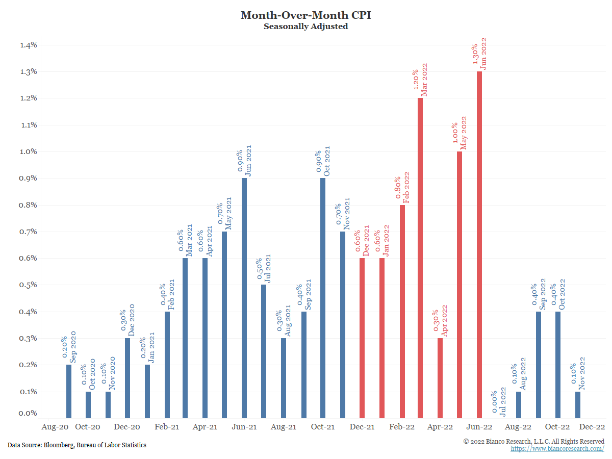 Between December 2021 and June 2022 (red), the month-over-month change in CPI was much higher than in the 2020 period. This means the current monthly numbers will have a much higher bar to surpass if inflation is going to remain elevated. This month’s 0.1% m/m change replaced a 0.7% m/m change from November 2021, which helps explain the continued drop in headline inflation.