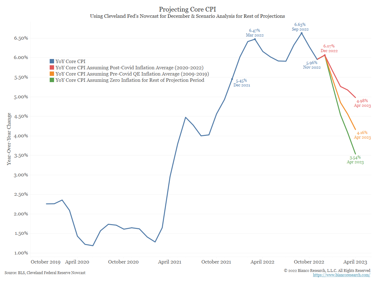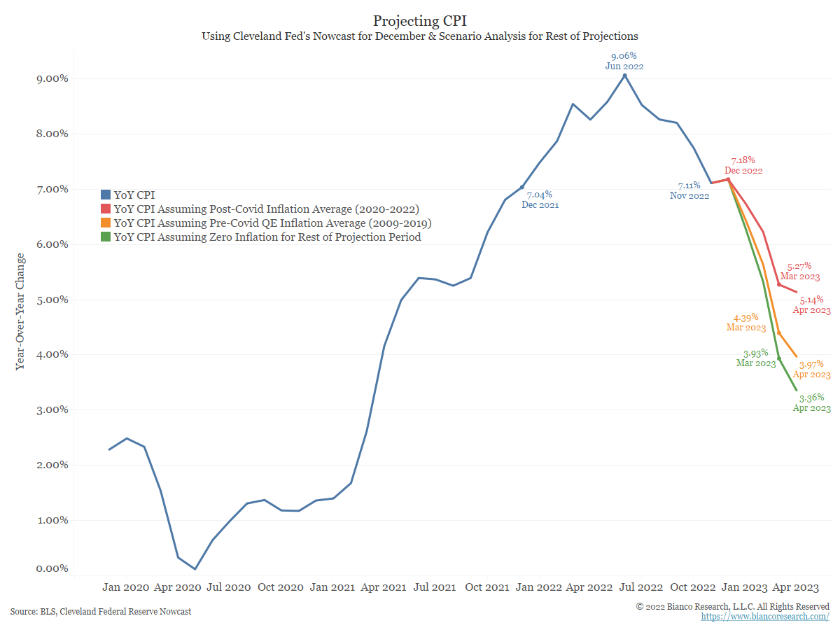 The blue line in the chart shows year-over-year CPI, which rose by 7.11% in the twelve months through November 2022. For the scenarios below, we assume the Cleveland Fed’s CPI Nowcast of 0.37% m/m inflation for December will be correct (notably Cleveland Fed has been too high the last two months).