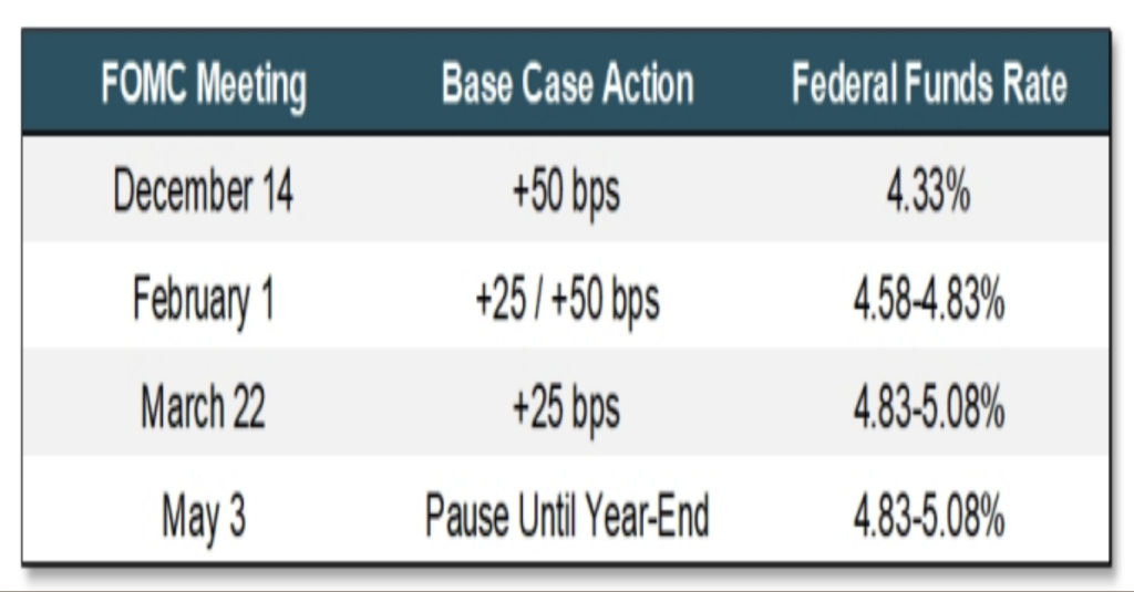 How long will policy remain restrictive? This is probably the most important question in determining an outlook. Our belief is that the Fed will reach a peak rate at around 5% (depending on the next couple of months’ inflation data) by March and stay at that peak rate for the rest of the year.