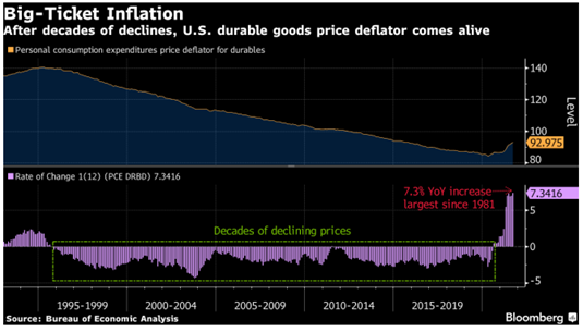 We’ve gotten to the point where we think inflation has become problematic. The benchmarks that Chairman Powell indicated back in August are, at least temporarily, backfiring. We are facing a supply/demand imbalance magnified by governments filling consumers’ pockets with “free” money while extensive global lockdowns hamstrung supply chains. Ultimately, consumption is exceeding production and we are seeing prices reset higher to get back towards an equilibrium. The Fed has remained (overly) accommodative with QE and Monetary Policy since the pandemic begun and this has extenuated the inflation dilemma.