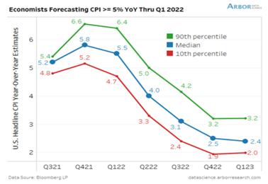 In addition, more and more economist (as polled by Bloomberg) expect headline inflation to remain above 5% well into Q1 ’22 and remain greater than the Fed’s 2% target through Q1 of ’23. More persistent inflation goes against the “transitory” rhetoric.