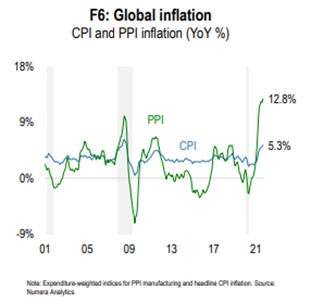 - Do DGT (Demographics, Globalization & Technological) forces continue to inject disinflationary pressures into the economy? With supply chain pressures causing massive goods disruption across the globe, we are dealing with a problem that is neither easily fixed nor solved by hiking interest rates. While demographics and technology are undeniably deflationary inputs to the long-term outlook on inflation, we don’t see these supply chain pressures quickly abating. Due to the U.S. being a major import economy, as global production costs increase (PPI), we’d expect CPI numbers to correlate (higher) as companies are forced to pass through costs to customers (and to consumers) to maintain profit margins. With persistent supply chain issues, the slack in supply chains continues to prove to be worse than expected.