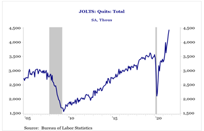 - Wage Pressures and Employee Negotiating Power are Becoming Powerful. If you are looking for a job, there are a plethora of job openings. The most recent JOLT job openings survey indicated that 10.43 million jobs were available. We are seeing a record number of employees quit their jobs (likely switching to higher paying jobs). In response to that, companies are paying higher wages which was evident in the most recent wage growth report (ECI) which showed wages growing at a 4.9% clip YoY. As the job market continues to tighten, we see wage pressures continuing to pressure inflation into ’22. Back in August, Chairman Powell indicated the likelihood of wage growth remaining muted as more workers came back into the work force alleviating pressure to hire. As we’ve seen a decent chunk of the labor force permanently remove themselves (early retirement, high asset valuations, crypto, etc.), this thesis seems less and less likely.