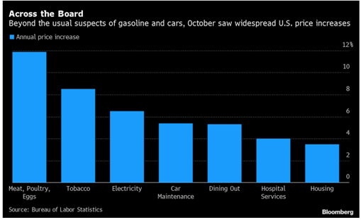 - Are Inflation Pressures Broad-Based? Back in August, Chairman Powell pointed out that many of the factors pulling inflation up were pandemic related and over time would normalize (i.e., the transitory components). Currently we are seeing broad based cost pressures across many of the components of CPI, which indicate more sticky inflation.
