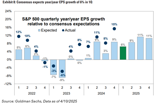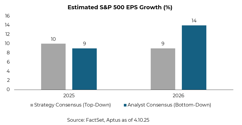 Q1 2025 earnings season officially began last week with the banks. Over the next few weeks, investors are hoping for important insight into the evolving outlook for corporate profits and activity, i.e., what will growth be in Q2 2025 and CY 2025? While markets have moved sharply in response to the shifting outlook on trade policy and economic growth, consensus earnings estimates have hardly budged. The S&P 500 has declined by ~12% year-to-date (“YTD”) and by 10% since the April 2nd tariff announcements, yet consensus S&P 500 EPS estimates for 2025 have only declined by just 2% YTD. Analysts expect 2025 S&P 500 EPS to grow by 9%, a lower bar relative to previous quarters and down from an expectation of 11% growth at the start of the year. For 2026, analysts are still calling for 14% growth – a number that hasn’t really changed this year.