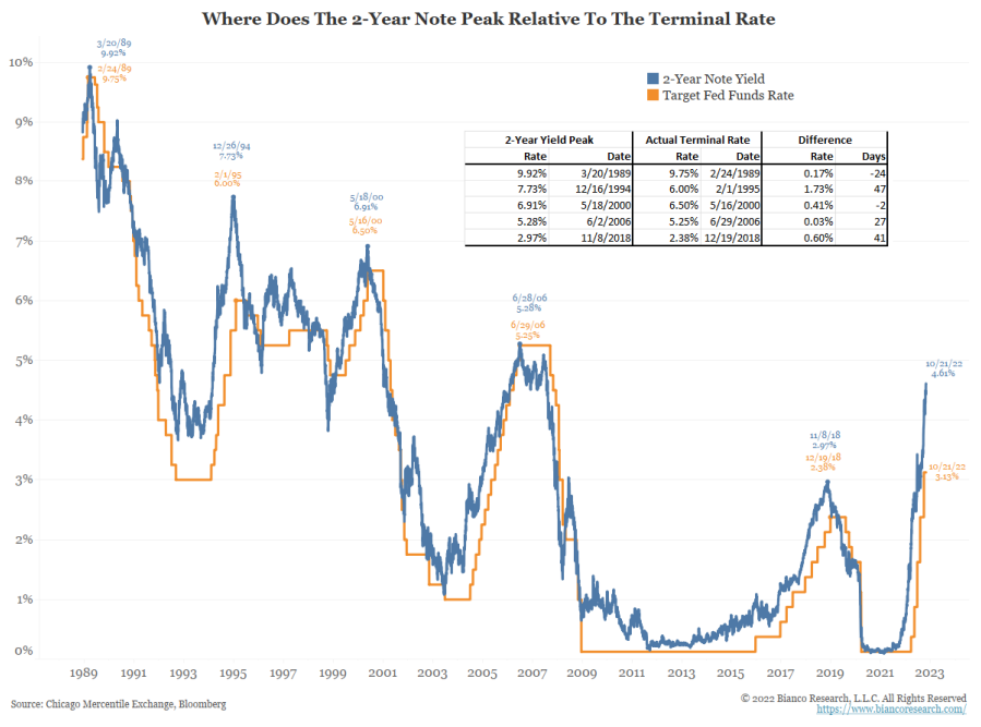 What does a 5% terminal rate mean for market-based interest rates, such as the 2-year Treasury? Bianco research ran an interesting analysis on the 2yr UST vs the Fed rate (shown below). The orange line below shows the target funds rate. The blue line shows the 2-year yield.