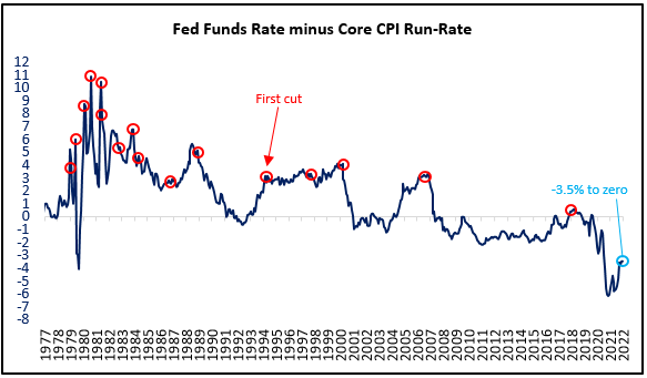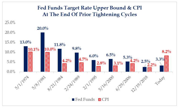Historically, the minimum condition for restrictive policy is a positive real rate (interest rates > inflation). Using headline, rightly or wrongly, there still is a way to go. As the chart below shows, in the end, the terminal Fed Funds rate has always been higher than the CPI at the end of prior tightening cycles. Will this time be different?