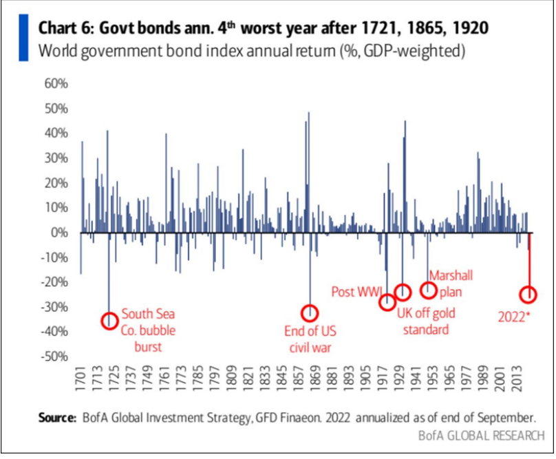 We’ve had a number of questions regarding peak interest rates. Interest rates have of course been a hot topic in 2022… the 4th worst year for government bonds since 1721 has led to an interesting backdrop of uncharted waters. Interest rates can be confusing, and we’ve had questions on whether the rise in rates we’ve experience is an opportunity to invest (in bonds) just because rates are higher now than what we’ve seen in 10-15 years. We’d note caution to this logic.