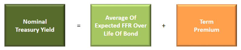 Bond yields are a function of economic activity, expected future inflation, and supply and demand. We use this graphic as a basic decomposition to look at Treasury yields that helps simplify some of the noise. Treasury yields (Risk-free bonds) have a Fed policy component (Fed Funds rate) and a term premium, which can comprise anything else other than Fed policy (liquidity, inflation, supply & demand, etc.). For bonds that aren’t risk free, there would be a credit spread added in (credit spread) to the calculation.
