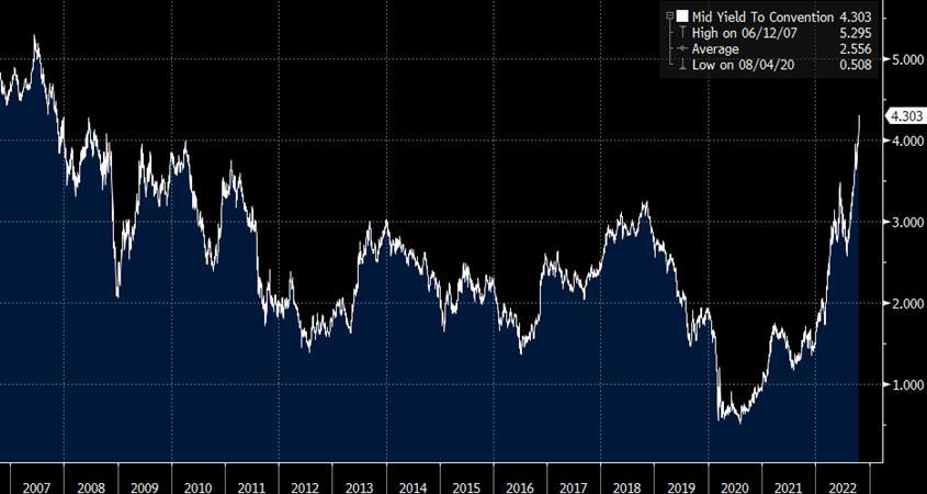 Treasury yields are once again higher this morning with the 10-year Treasury hitting its highest yield in 15 years. It’s currently at 4.32% which matches yields last visited in 2007. The 10-year yield has risen since it hit an intra-day low on Monday, climbing to 42bps this week, 3.90%. The 2yr yield has risen “only” 20bps this week, so some curve re-steepening is occurring.