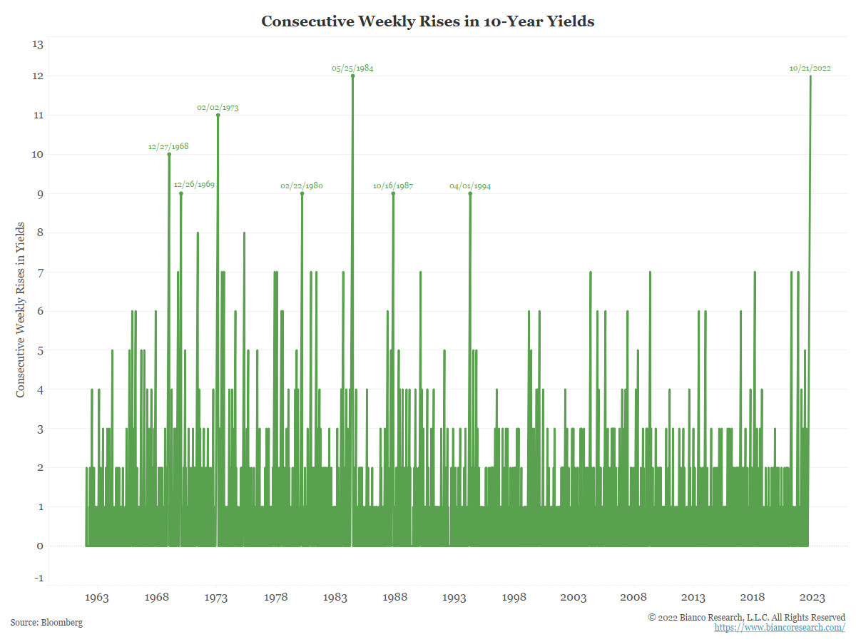 Following today, we’ll have seen 12 consecutive weeks of higher 10-year Yields which would tie with May, 1984 for the largest such streak since data began in 1962.