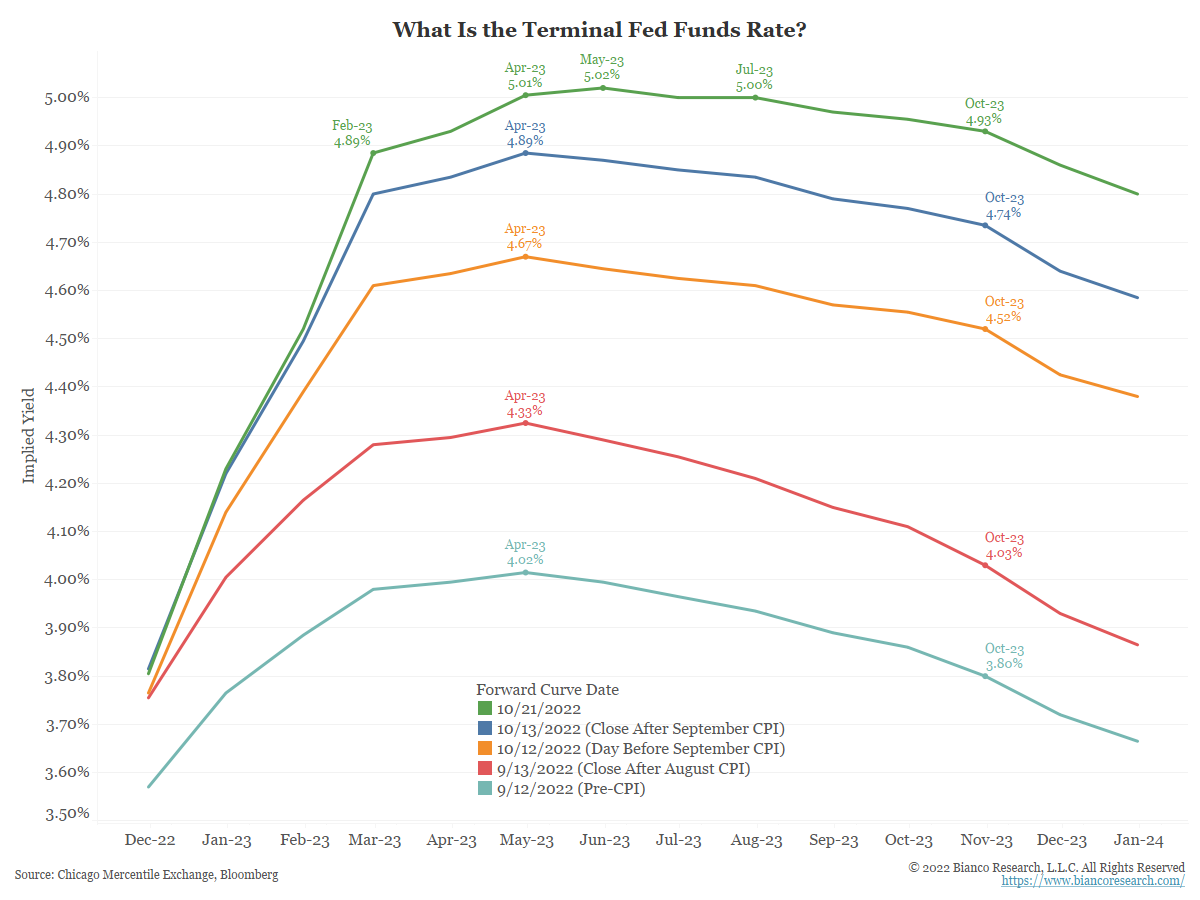 How does the funds rate get to 5%? The market has priced a 98% probability the Fed hikes by 75 basis points on November 2nd, to a range of 3.75% – 4.00%. The market is pricing another 75% chance of 75bps again in December. If this happens, it would put the funds rate at a range of 4.50% – 4.75%, just one 25 basis point hike away from 5%. It would also mark the 5th consecutive 75 basis point hike this year.