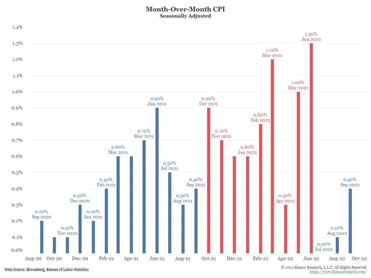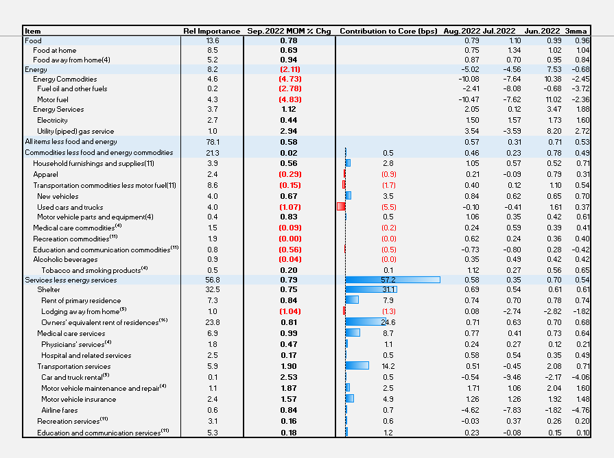 On a positive note, even with the larger-than-expected gain in September, the annual pace of headline inflation did slow from 8.3% to 8.2%. The main differences between Core and “headline” CPI month over month were driven by Food +0.8% vs Energy -2.1%, the third consecutive month of cooling price pressures (we do note prices at the pump have been up in October).