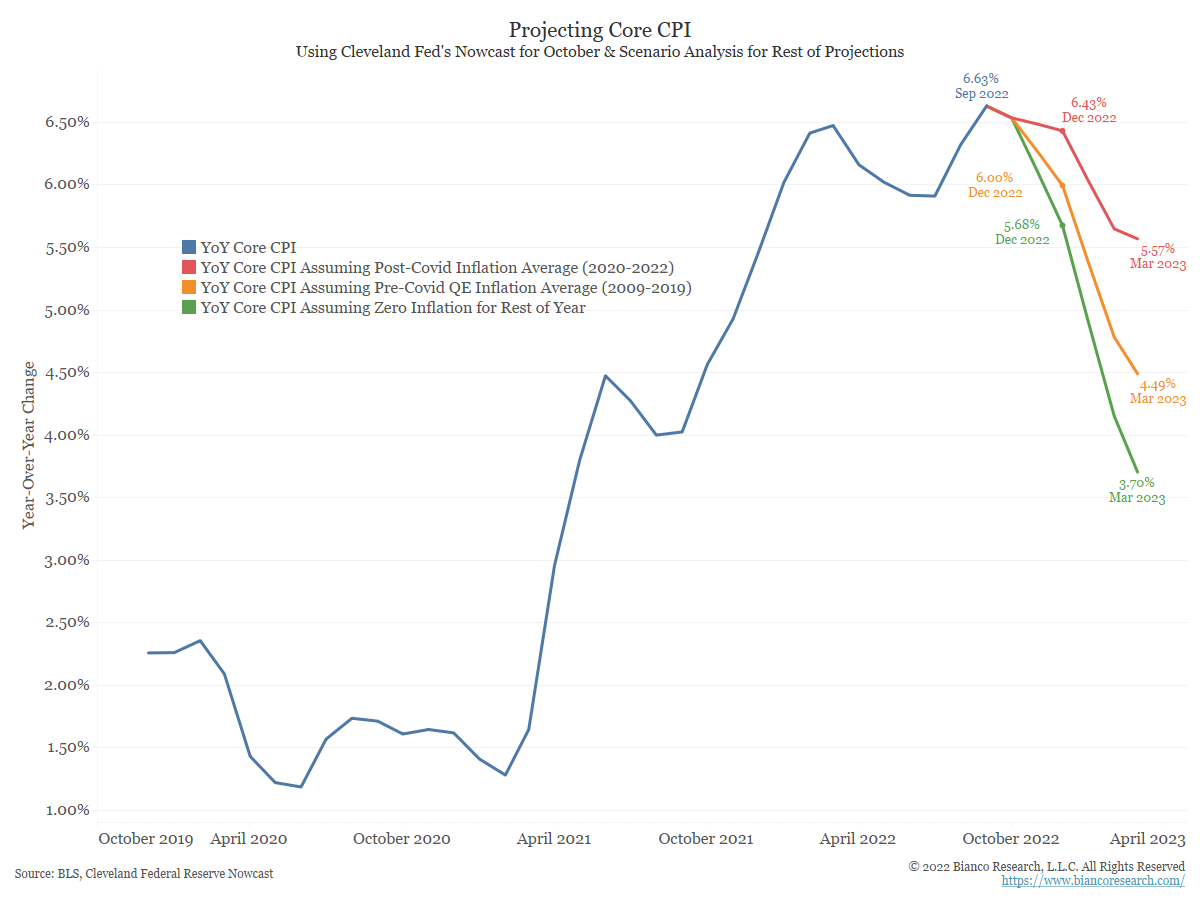 For the scenarios above (run by Bianco Research), they assume the Cleveland Fed’s CPI Nowcast of 0.72% m/m inflation for October will be correct. I’d note that Cleveland Fed has been more accurate than Wall Street but still undershoots actual inflation most months during this inflation cycle.