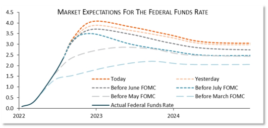 It’s very clear to at least the bond market that the Fed won’t turn less hawkish any time soon. The bond market expects the Fed to continue to raise rates, even at an aggressive pace, for at least the rest of the year—another 75-bp hike next week is priced in with certainty, with a chance of 100 bps.