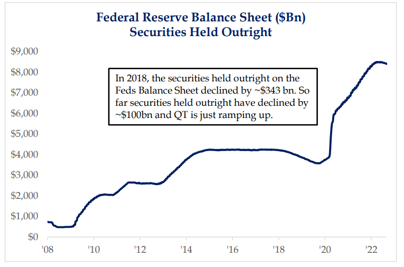Quantitative Tightening (QT) has not been discussed enough – the scheduled run-off in the size of the assets on the Fed’s Balance Sheet to the tune of $95 billion a month. As the chart below indicates, the Fed is in the very early stages of draining the $5 trillion in excess liquidity pumped into the economic system since the pandemic began.