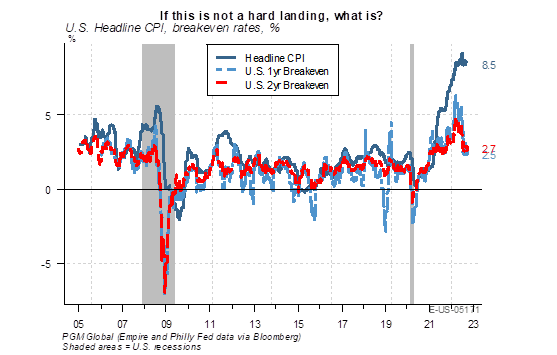 While it’s fun to be hawkish, the big test will come when the Committee faces a serious trade-off between growth and inflation. What if the economy is clearly sliding into a recession but inflation is getting stuck at ~3%? Faced with a serious trade-off, are they fully committed to getting inflation down to 2% in a timely manner? Do they acknowledge that their inflation forecast is wrong and remain hawkish? We will then see what the new nest really looks like.