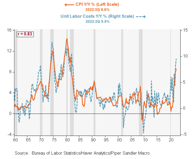 In 2Q, both were inflationary. Compensation growth was a rapid 6.7% Y/Y, and productivity plunged by a record (yes, a record) -2.6% Y/Y, driving ULCs up 9.5% Y/Y — the most since 1981. So while inflation is likely to slow, as outlined above, ULC growth must reverse on a sustained basis to ensure broad inflation gets down and stays down. Since 1960, there’s an 83% correlation between ULCs and the CPI…the chart is striking, and worrisome.