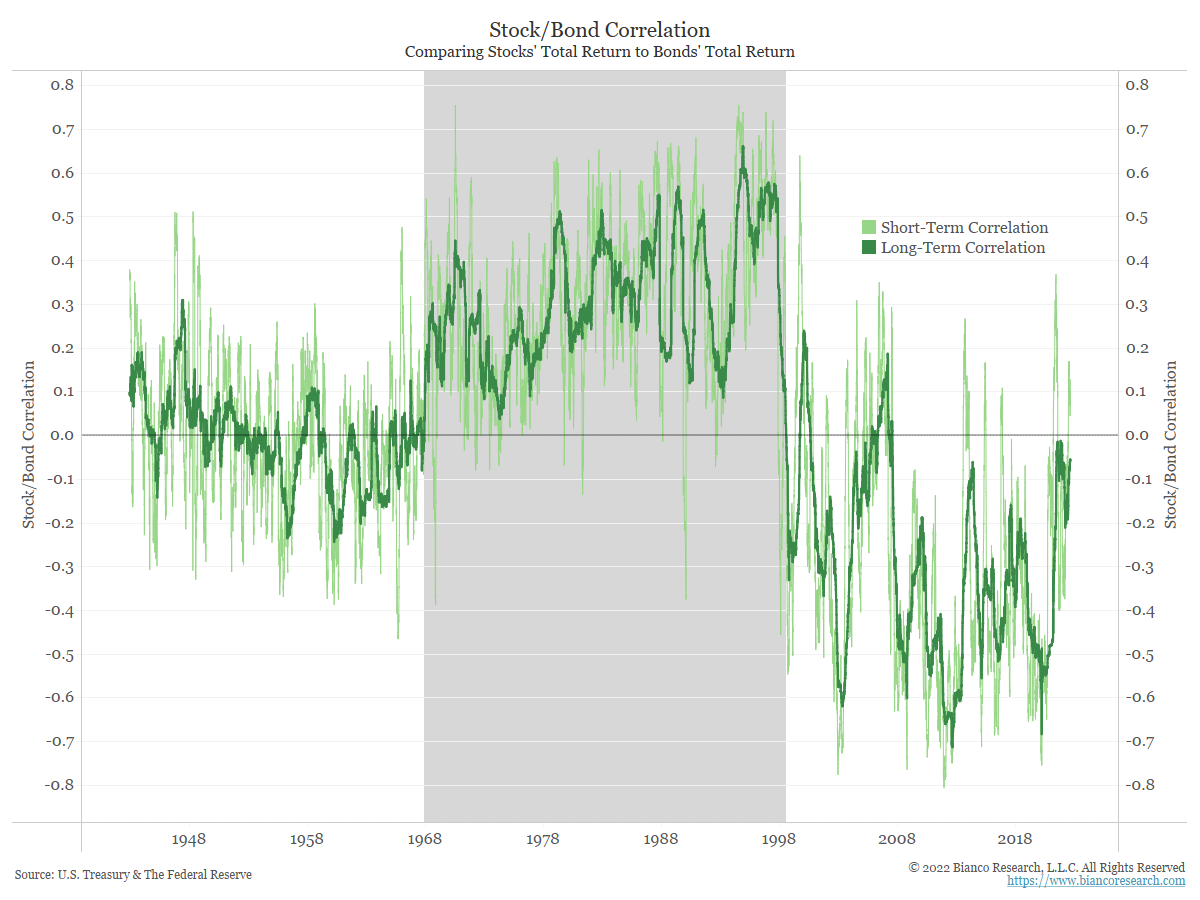 The shaded area in the chart highlights the period from 1967 to 1998 when stock and bond returns were positively correlated. Quarterly correlations are shown in light green, while yearly correlations are shown in dark green. During this time, high inflation concerns were the driver of this relationship. When markets were relieved there was no inflation, bond yields went down (prices up) and stock prices went up. When the markets worried inflation was heating up, bond yields went up (prices down) and stock prices went down.