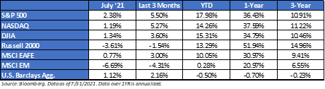 - The Fed promised that rates would remain in the 0% – 0.25% range through 2023, with the goal of stoking inflation to moderately exceed 2% for some time. Fed Chair Powell seemed more dovish in the July press conference vs. the relatively hawkish committee projections. He opened the door to a discussion on QE tapering, but noted that the U.S. is still not at the “substantial further progress” standard that would allow policy normalization. It doesn’t appear that they are worried about the Delta variant at the moment. The Fed dots (forecasts for future fed funds) rose from the zero bound in 2023, but Powell noted that there is a large amount of uncertainty over the next 2 years.