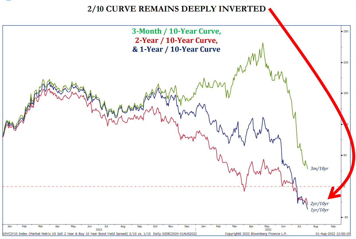 The Curve is Deeply Inverted: The aggressive hiking schedule initiated by the Fed has driven front end yields to levels last seen in 2007 (2018 the 2Y peaked at 2.95%). The Fed’s preferred curve is the 3-month yield minus the 10-year yield (3M/10Y). This curve was +200bps as recently as June 20th and is now on the brink of inversion… another hike in September (especially a supersized one 50 or 75bps) will likely further invert the structure of the yield curve (2Y/10Y is currently 34bps inverted).  An inversion of the 3M/10Y has been a very good historical indicator of recessions.