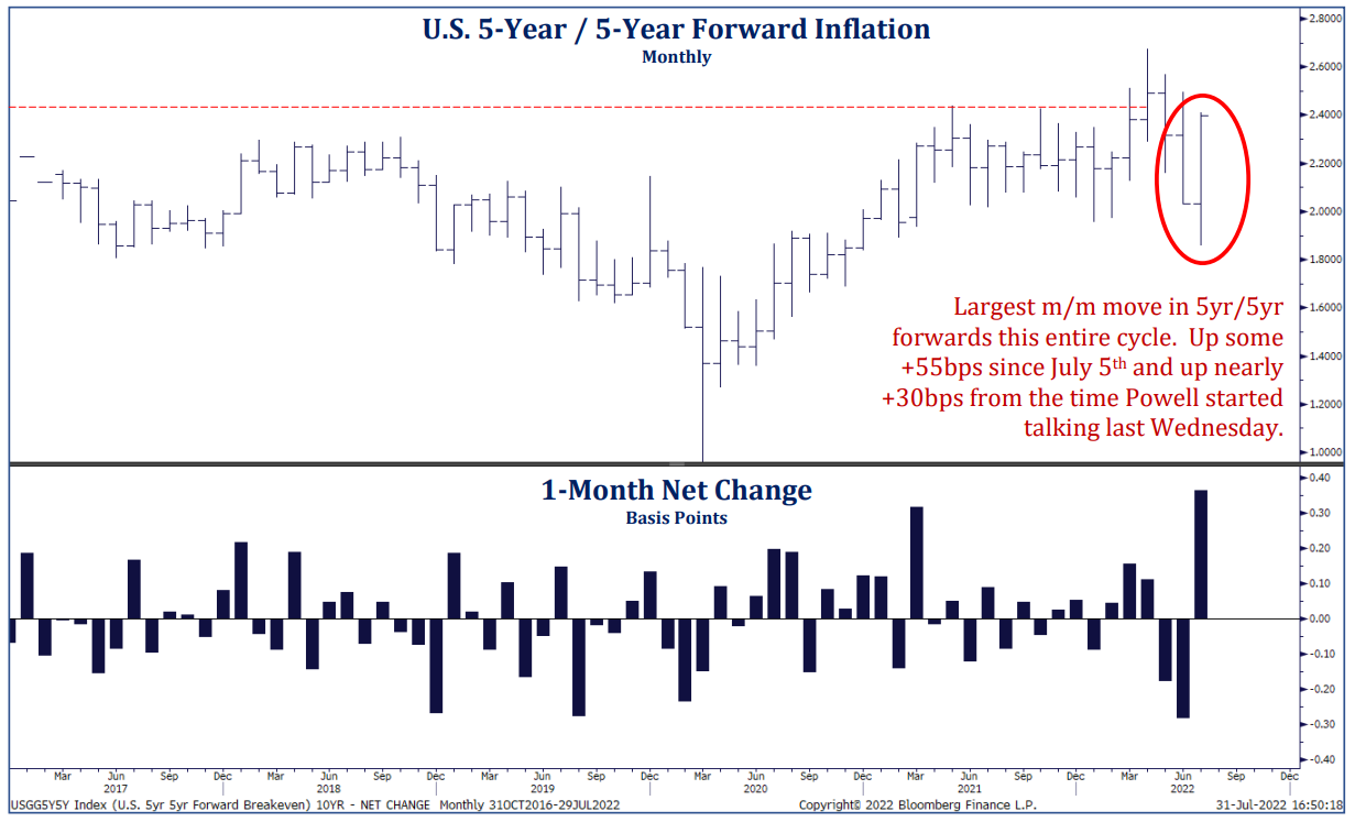 The surge in 5-year / 5-year forward breakeven inflation over the last few weeks has gotten our attention, particularly after Powell’s press conference on Wednesday afternoon. July marked the largest m/m change for the series this entire cycle (up some 55bps since July 5th) where the bulk of that move came in just the last several days. We believe this could be the market’s way of saying, “OK FOMC, if you get more dovish now, you’re going to lose the progress you’ve made on anchoring longer-term inflation expectations.” The answer may be more nuanced, but against the backdrop of a consensus “peak inflation” call, this move seems notable to us.