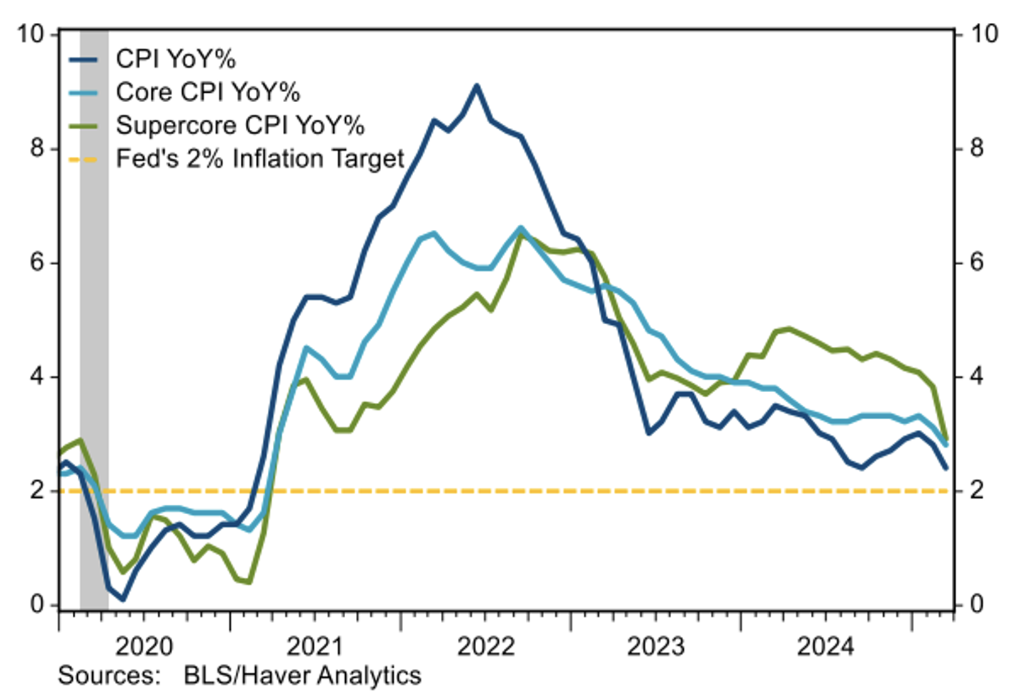 On the core goods side, prices fell 0.1% MoM on fairly broad declines, including a 0.7% drop in used vehicle prices. Prescription drug prices fell 2.0% MoM, the largest drop in records back to 1969. The breadth of declines in core goods prices puts on the back burner, at least for the time bein,g growing concerns about rising goods inflation due to tariffs.