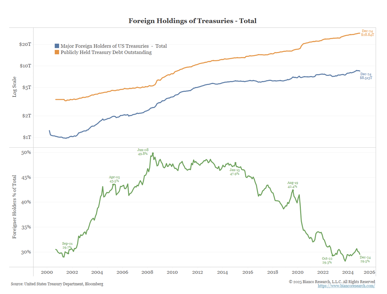 Foreigners currently hold $8.5T (blue) of the $28.8T of publicly held debt (orange) for a total of 29.5% of debt outstanding (green). This ratio fell from 2008 until 2022 as the Fed was a huge buyer via QE.