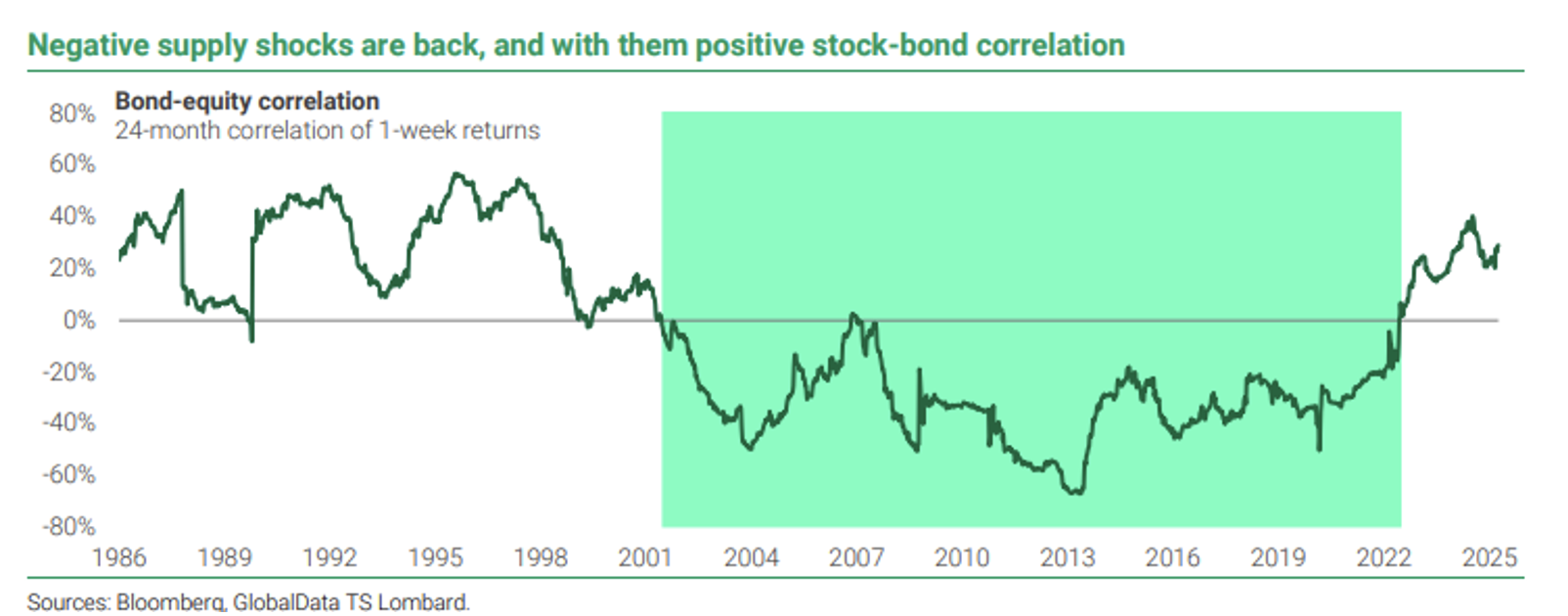 The bond-equity correlation was negative for most of the 2000s but turned positive following COVID-induced supply shocks.