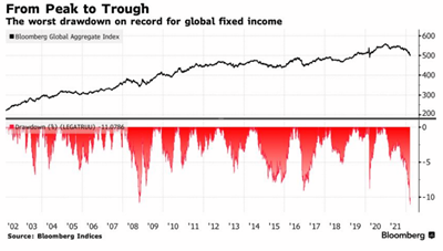* Bonds… A Rough Stretch: The Bloomberg Global Aggregate Index, a benchmark for government and corporate debt, has fallen 11% from a high in early 2021. That’s the biggest decline from a peak in data stretching back to 1990, surpassing a 10.8% drawdown during the financial crisis in 2008. Another fun fact: Bonds are actually underperforming stocks for the year by about 75bps (AGG – 6.00% & SPY -5.25% as of 3/24/22).